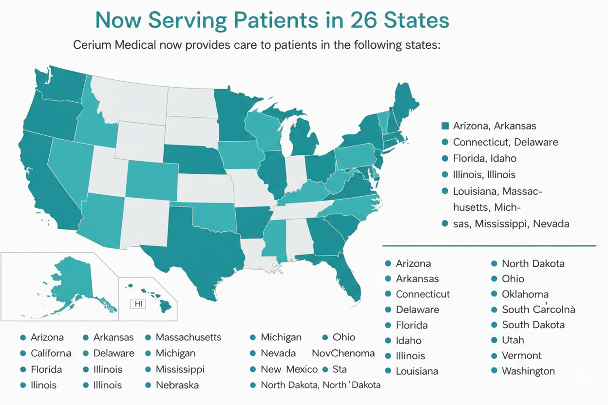 We’re excited to share that Cerium Medical has expanded our telehealth services, allowing us to care for patients in 26 states nationwide.